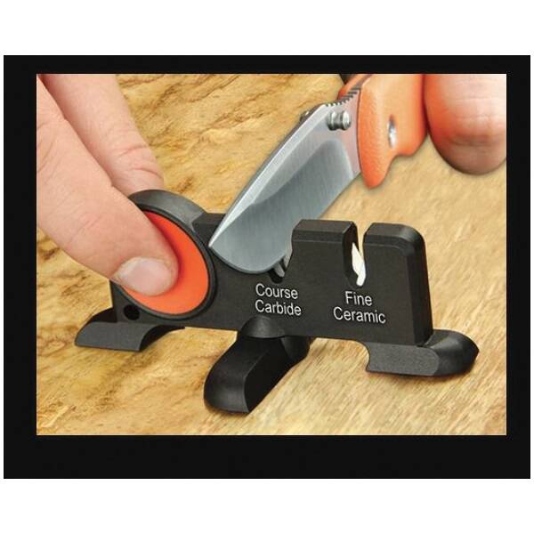 The perfect, pocket-sized sharpener for shaping and maintaining a razor-sharp edge on all your outdoor and kitchen knives. The pivoting X-base folds out to improve safety and stability during sharpening for a more precise edge. Set at a universal 22° angle, the coarse tungsten carbide bits reshape a dull blade quickly, while the fine ceramic rods finish the blade to a razor's edge. The rubberized TPR finger hold ensures a non-slip grip and four 3M® rubber foot pads secure the X-base to most any flat surface. After use, the Sharp-X folds down flat for storage.