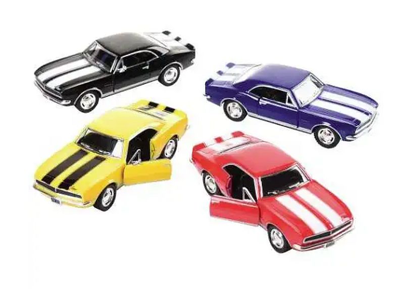 This classic muscle car with racing stripes is ready to drag race. Pull back motor action and opening doors. Made of metal and plastic. Item is 5-inches long, 1:37 scale replica. Assorted styles and colors.