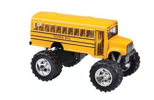 Die cast school bus with monster truck wheels and springs for suspension. Pull back and watch 'em go. Made of metal and plastic.