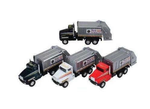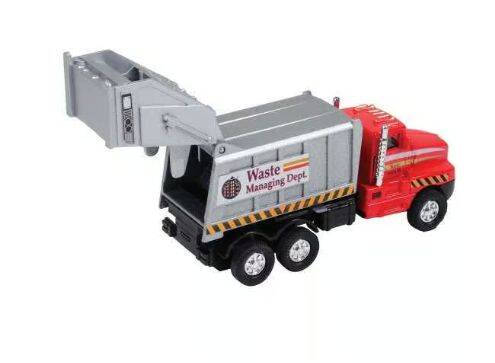 This city garbage truck operates just like a real one with a moving compactor. Pull back action. Made of metal and plastic.