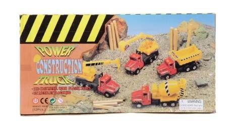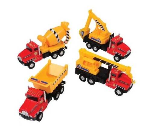 Construction trucks moving parts on this construction truck assortment makes playtime more real. Pull back action. Made of metal and plastic.