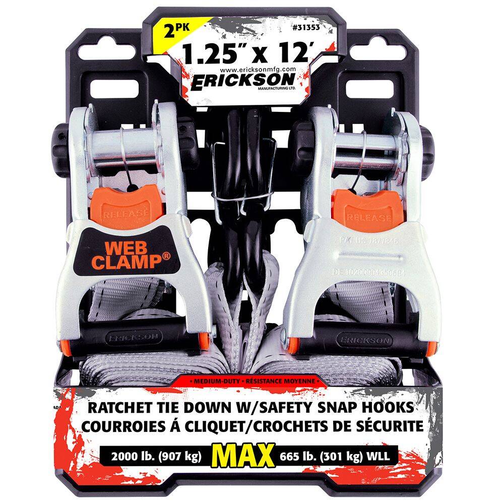 1-1/4-Inch x 12-Foot 2000-Pound Deluxe Tie-Downs With Web Clamp Safety Snap Hooks 2-Pack