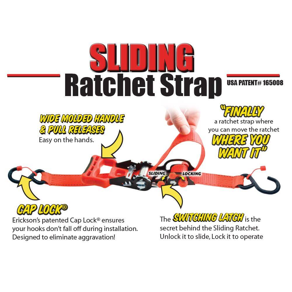 Wide Handle Molded Handle & Pull Releases, Easy on the hands. The Switching Latch is the secret behind the Sliding Ratchet. Unlock it to slide, Lock it to operate. CAP LOCK®  – Erickson’s patented Cap Lock® ensures your hooks don’t fall off during installation.
