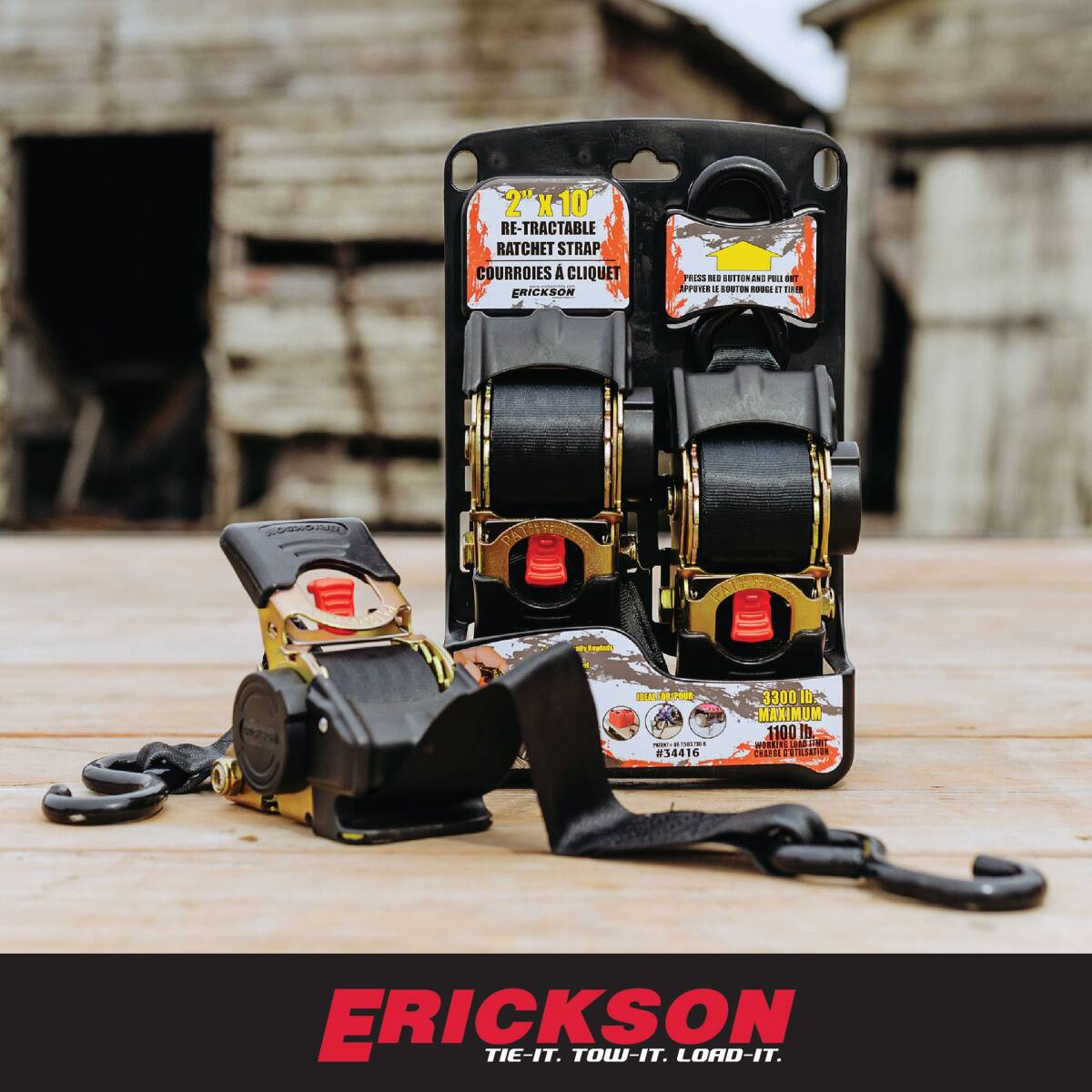 Unlike the conventional Ratchet straps we have all grown to love and count on for all our Tie Down needs, the RE-TRACTABLE RATCHETS are by far the best choice and our number one sellers. So smooth to use, simply ratchet tight and to release simply push down on the red release button, and zoom the web rewinds in to the storage housing just like a tape measure. Check out our BOLT ON models, ideal for boat transoms, pick up racks, permanent mounts on utility trailers, the ideas are endless. Once you use Erickson Re-tractable you won’t want anything else.