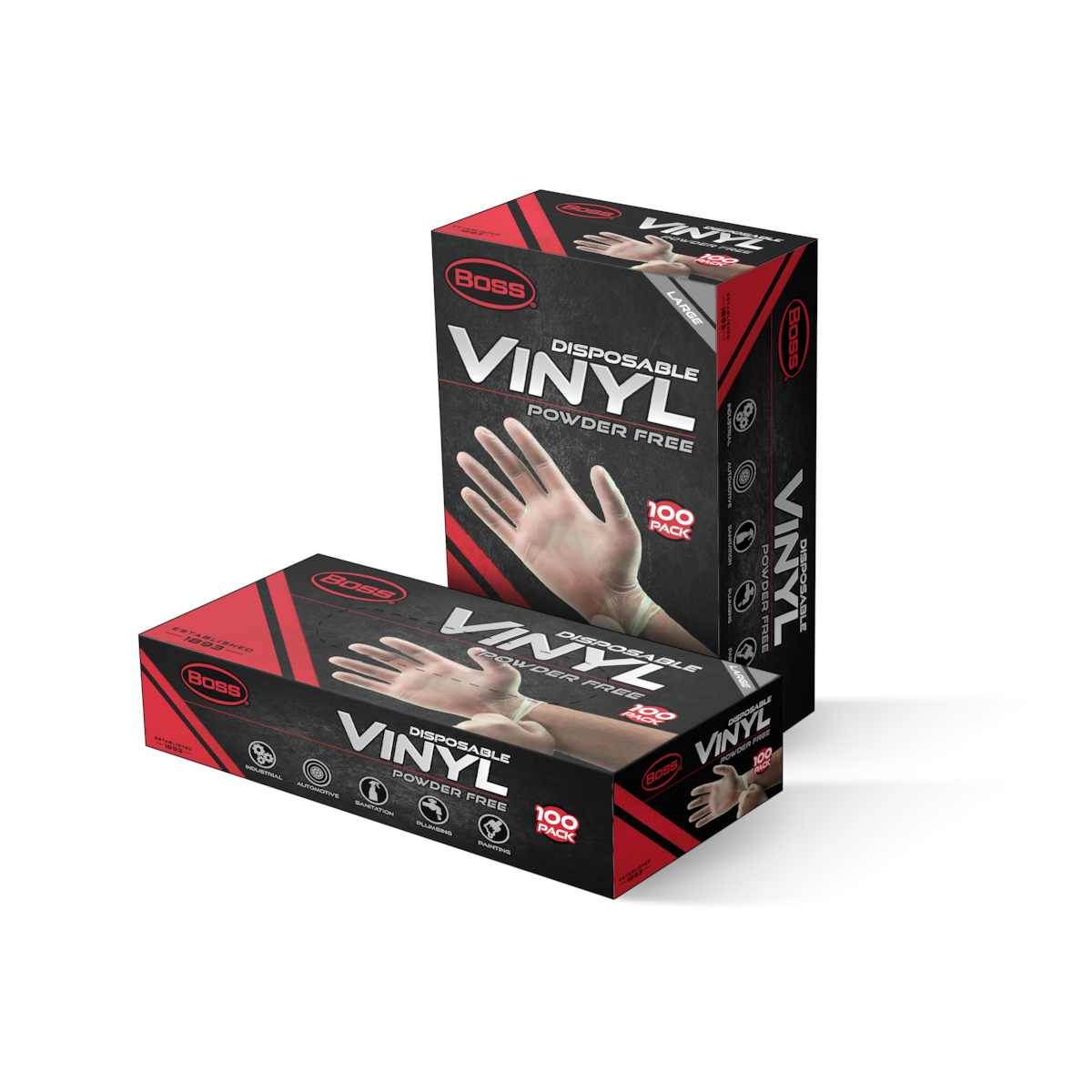 The Boss® Disposable Vinyl gloves, available in a 100 count box, designed to provide the utmost comfort and protection in various professional and personal settings. Manufactured with vinyl, a synthetic polymer, ensuring exceptional resistance to liquids, water, and oils. The powder-free design eliminates the risk of potential allergies and irritations, making these gloves suitable for individuals with sensitive skin. This feature also prevents any unwanted residue on the hands. The latex-free feature makes these gloves and ideal choice for individuals with latex allergies or sensitivities. The inclusion of a wing thumb design further enhances flexibility and dexterity and allows these gloves to be ambidextrous. These Disposable Vinyl gloves will allow you to experience the epitome of protection, comfort, and convenience.