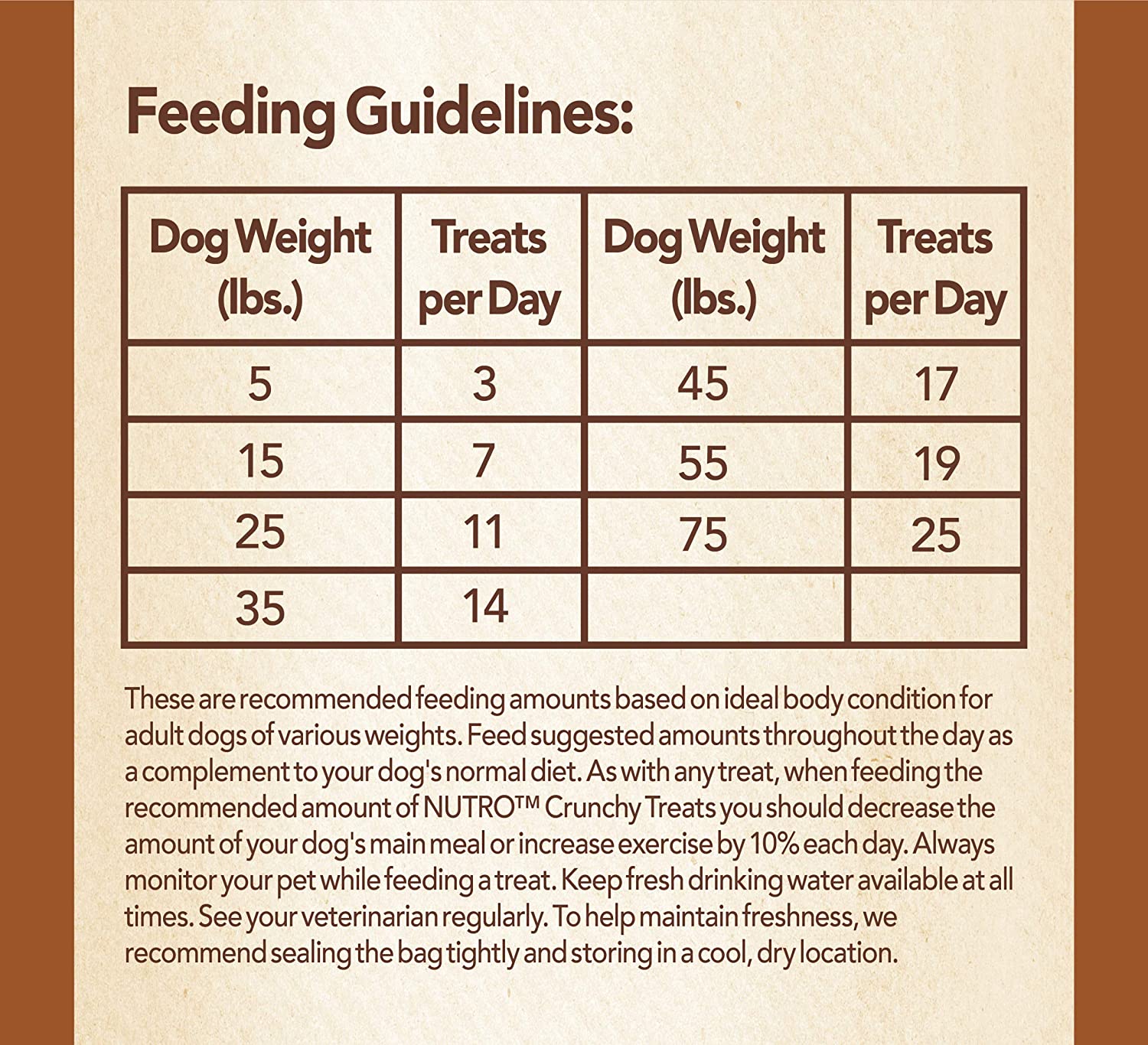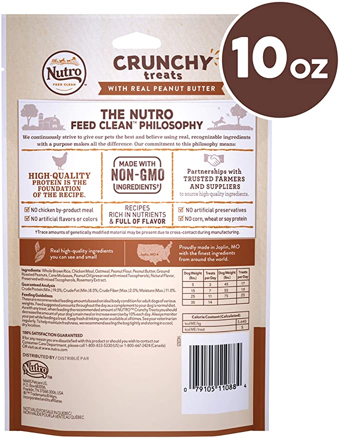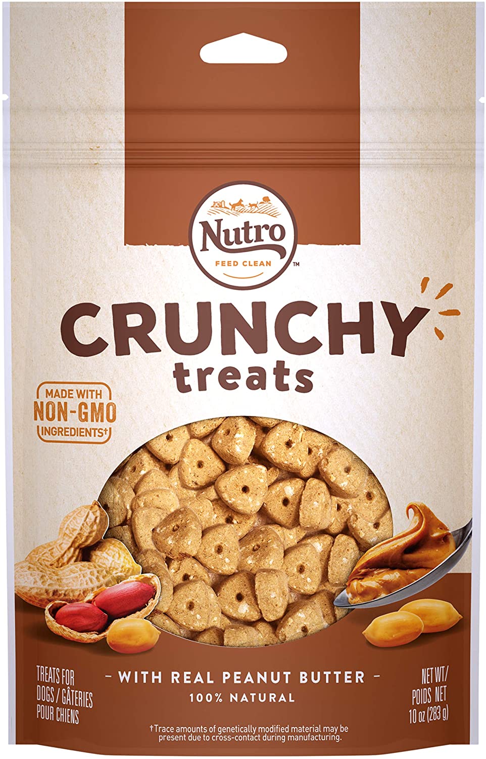 Feel good about the treats you give to your dog with our natural dog treats. Nutro crunchy treats with real peanut butter are made with high-quality, natural ingredients you can see and smell. These premium, non-GMO treats are only five calories per piece and contain no chicken by-product meal, no artificial flavors or colors, no artificial preservatives, no corn, wheat or soy protein. Rich in nutrients and full of flavor, our natural dog treats are a healthy way to show your dog you love them.