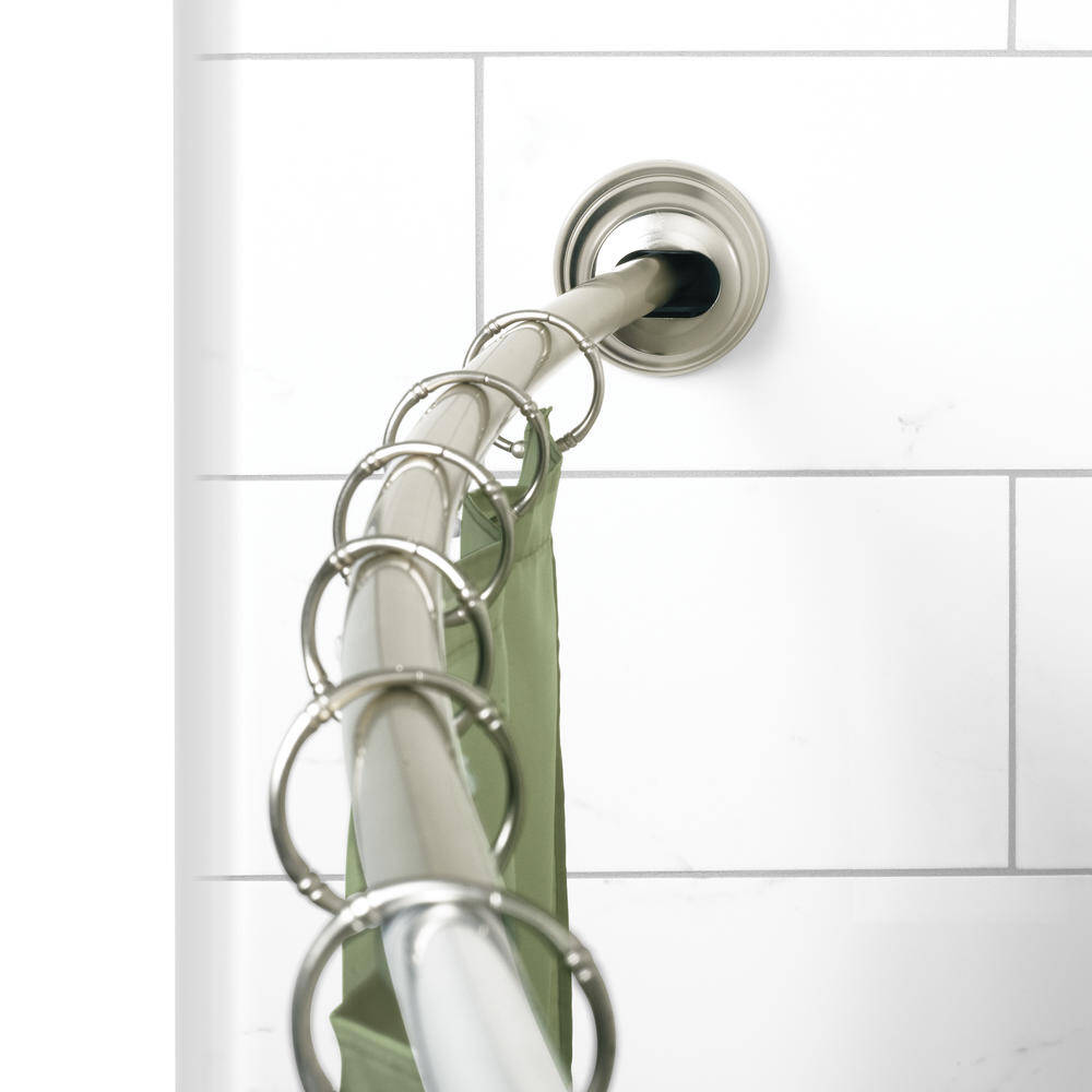 Satin Nickel Aluminum Dual Mount Curved Shower Curtain Rod adjusts from 50 to 72 inches, shower base to ceiling and can be installed with no tools.