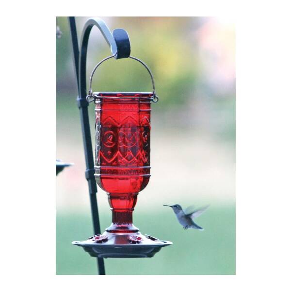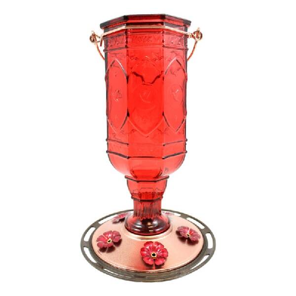 Hummingbirds are nature's gems, so attract more hummers to bedeck your backyard with a More Birds Red Jewel 20 oz hummingbird feeder. This stunningly red, vintage eight-sided glass bottle design features elegant hummingbird motifs that add a splash of bygone beauty to your backyard. With polished copper accents and wrap-around perching space, the Red Jewel is built with a durable metal basin cap that includes five metal flower feeding ports in polished red. Its wide bottleneck opening and detachable flat base make filling easy and cleaning a breeze. With a 20 oz nectar capacity, the Red Jewel provides plenty of nectar to keep hummingbirds happy and coming back for more. For best results, use More Birds premium nectar, which simulates natural nectar found in flowers.