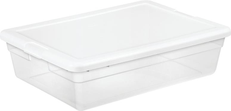 Get organized with the Clear Storage Box line! The 28 Qt Storage Box is ideal for a variety of basic household storage needs, helping to keep your living spaces neat. The clear base allows contents to be easily identified at a glance, while the opaque lid snaps firmly onto the base to keep contents contained and secure. Stack same size containers on top of each other for efficient use of vertical storage space. This storage box is ideal for sorting and storing towels, clothing and linens and fits conveniently underneath the bed for out of sight storage. The 28 Qt and 56 Qt Storage Boxes use the same lid, allowing both the shallow and deep sizes to be stacked in the same footprint. The overall assembled dimensions for this item are 23 in x 16-1/4 in x 6 in