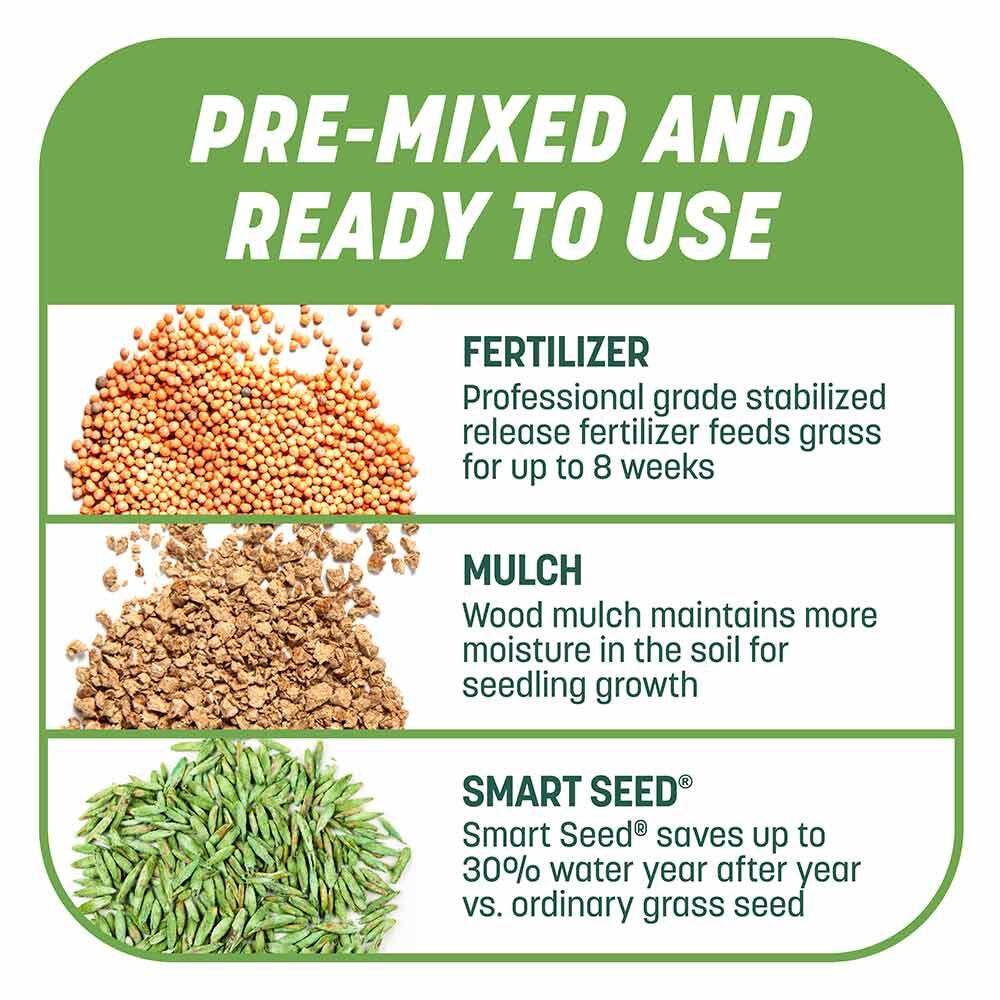 Our Smart Patch seeding mixture is drought tolerant and contains just the right amount of fertilizer to help your lawn succeed, along with mulch that turns a lighter color when dry - notifying you that its time to water again. Plant this grass seed mix in the early spring or early fall and begin to see growth in as little as 5 days and full results as soon as 14 days. For optimum coverage, use 1 lb per 4 square feet. For extended coverage use 1 lb per 20 square feet.