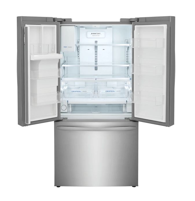 This Frigidaire French door refrigerator helps keep fruits and vegetables fresh longer with CrispSeal crispers which blocks dry air from entering your crisper. Easily stay organized with a full-width deli drawer & Large door bin storage. Our large bins offer more door storage, without sacrificing valuable shelf space.
