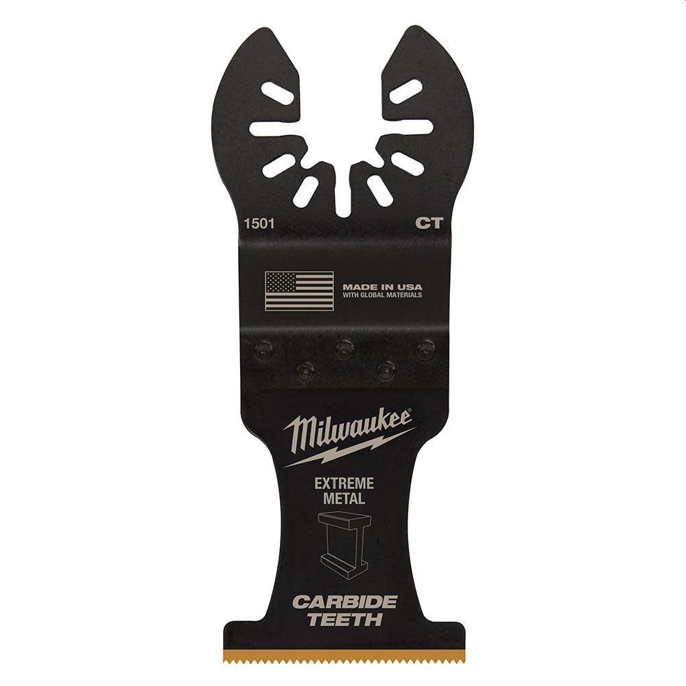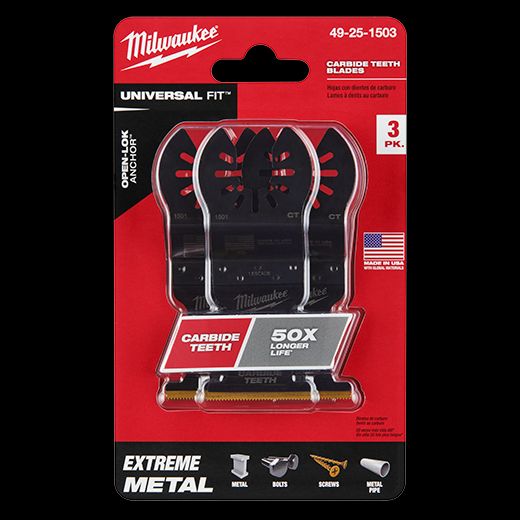 Our Universal Fit OPEN-LOK Titanium Enhanced Carbide Teeth EXTREME Materials Blades for Oscillating Multi-Tools are designed for use in the most Extreme material cutting applications. For use in wood, screws, nails, cement board, plaster, and other cutting applications, the Titanium Enhanced Carbide Teeth Extreme Materials Blade is complete with a thinner blade and unique aggressive tooth design that offers faster cutting performance in wood when compared to the standard carbide blade. The Extreme Materials Carbide Teeth Blade lasts up to 50X longer than standard bi-metal blades and can be used in a wide range of materials. These Milwaukee multi-tool blades are designed and made in the USA with global materials.