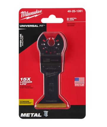 Our Universal Fit OPEN-LOK Titanium Enhanced Bi-Metal Multi-Material Oscillating Multi-Tool Blades are made from premium high-speed steel. These bi-metal blades are ideal for cuts in wood, nails, PVC, and drywall. The MILWAUKEE bi-metal multi-tool blades are enhanced with a titanium coating to deliver longer life and faster cuts than the previous generation. These oscillating multi-tool blades are designed and made in the USA with global materials. Available in 1-3/8 in and 2-1/2 in widths in 1, 3, or 10 packs and 3/8 in , 1-1/4 in , and 3-1/2 in in 1 pack.