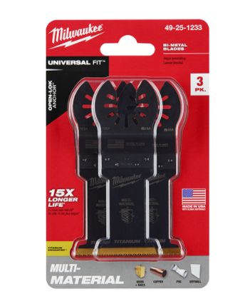 Our Universal Fit OPEN-LOK Titanium Enhanced Bi-Metal Multi-Material Oscillating Multi-Tool Blades are made from premium high-speed steel. These bi-metal blades are ideal for cuts in wood, nails, PVC, and drywall. The MILWAUKEE bi-metal multi-tool blades are enhanced with a titanium coating to deliver longer life and faster cuts than the previous generation. These oscillating multi-tool blades are designed and made in the USA with global materials. Available in 1-3/8 in and 2-1/2 in widths in 1, 3, or 10 packs and 3/8 in , 1-1/4 in , and 3-1/2 in in 1 pack.