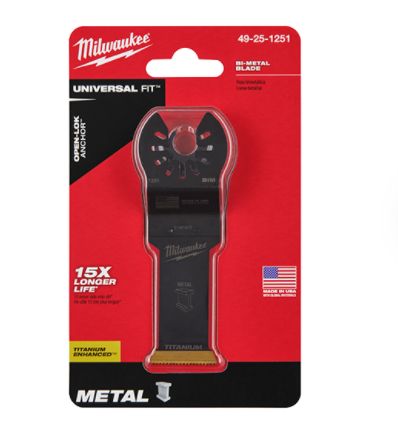 Our Universal Fit OPEN-LOK Titanium Enhanced Bi-Metal Multi-Material Oscillating Multi-Tool Blades are made from premium high-speed steel. These bi-metal blades are ideal for cuts in wood, nails, PVC, and drywall. The MILWAUKEE bi-metal multi-tool blades are enhanced with a titanium coating to deliver longer life and faster cuts than the previous generation. These oscillating multi-tool blades are designed and made in the USA with global materials. Available in 1-3/8 in and 2-1/2 in widths in 1, 3, or 10 packs and 3/8 in , 1-1/4 in , and 3-1/2 in in 1 pack.