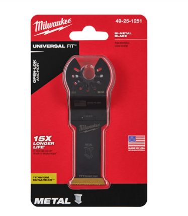 Our Universal Fit OPEN-LOK Titanium Enhanced Bi-Metal Multi-Material Oscillating Multi-Tool Blades are made from premium high-speed steel. These bi-metal blades are ideal for cuts in wood, nails, PVC, and drywall. The MILWAUKEE bi-metal multi-tool blades are enhanced with a titanium coating to deliver longer life and faster cuts than the previous generation. These oscillating multi-tool blades are designed and made in the USA with global materials. Available in 1-3/8 in and 2-1/2 in widths in 1, 3, or 10 packs and 3/8 in , 1-1/4 in , and 3-1/2 in in 1 pack.
