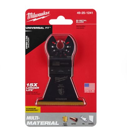 Our Universal Fit OPEN-LOK Titanium Enhanced Bi-Metal Multi-Material Oscillating Multi-Tool Blades are made from premium high-speed steel. These bi-metal blades are ideal for cuts in wood, nails, PVC, and drywall. The MILWAUKEE bi-metal multi-tool blades are enhanced with a titanium coating to deliver longer life and faster cuts than the previous generation. These oscillating multi-tool blades are designed and made in the USA with global materials. Available in 1-3/8 in and 2-1/2 in widths in 1, 3, or 10 packs and 3/8 in , 1-1/4, and 3-1/2 in in 1 pack.