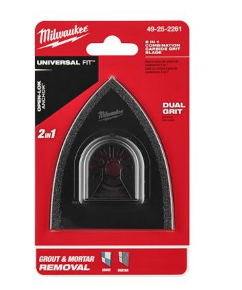 Our Universal Fit OPEN-LOK 2-in-1 Hybrid Carbide Grit Blade 1 Pack is designed for Oscillating Multi-Tools. This unique dual carbide grit 2-in-1 blade gives you an all-in-one tool for tile work. The fine grit carbide on the edge allows you to quickly remove grout, and the coarse carbide grit on the bottom of the blade removes mortar fast. The multi-tool blade features MILWAUKEE Universal Fit OPEN-LOK Anchor for quick blade changes.