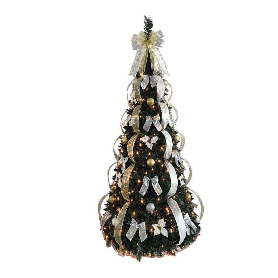 This lush green beauty arrives pancake-flat and pops up into a 6 ft pre-lit Christmas Tree when attached to the included stand. After the holidays, cleanup and storage is just as simple thanks to its practically flat compressed design. Simple to assemble and pre-lit with 350 UL white lights. It comes decorated with French ribbons, bows, and ornaments.