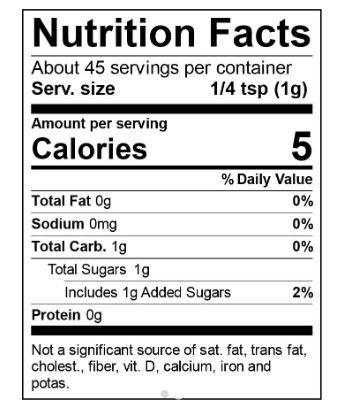 Nutritional Information 5 Calories, 0 g Total Fat, 10 mg Sodium, 1 g Total Carbohydrate, 1 g Sugar, 0 g Protein