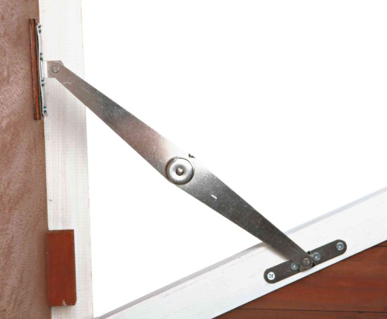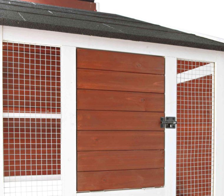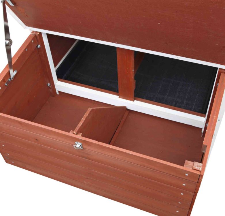 • Hinged roof with locking arms open above sleeping house and nest area for collecting eggs