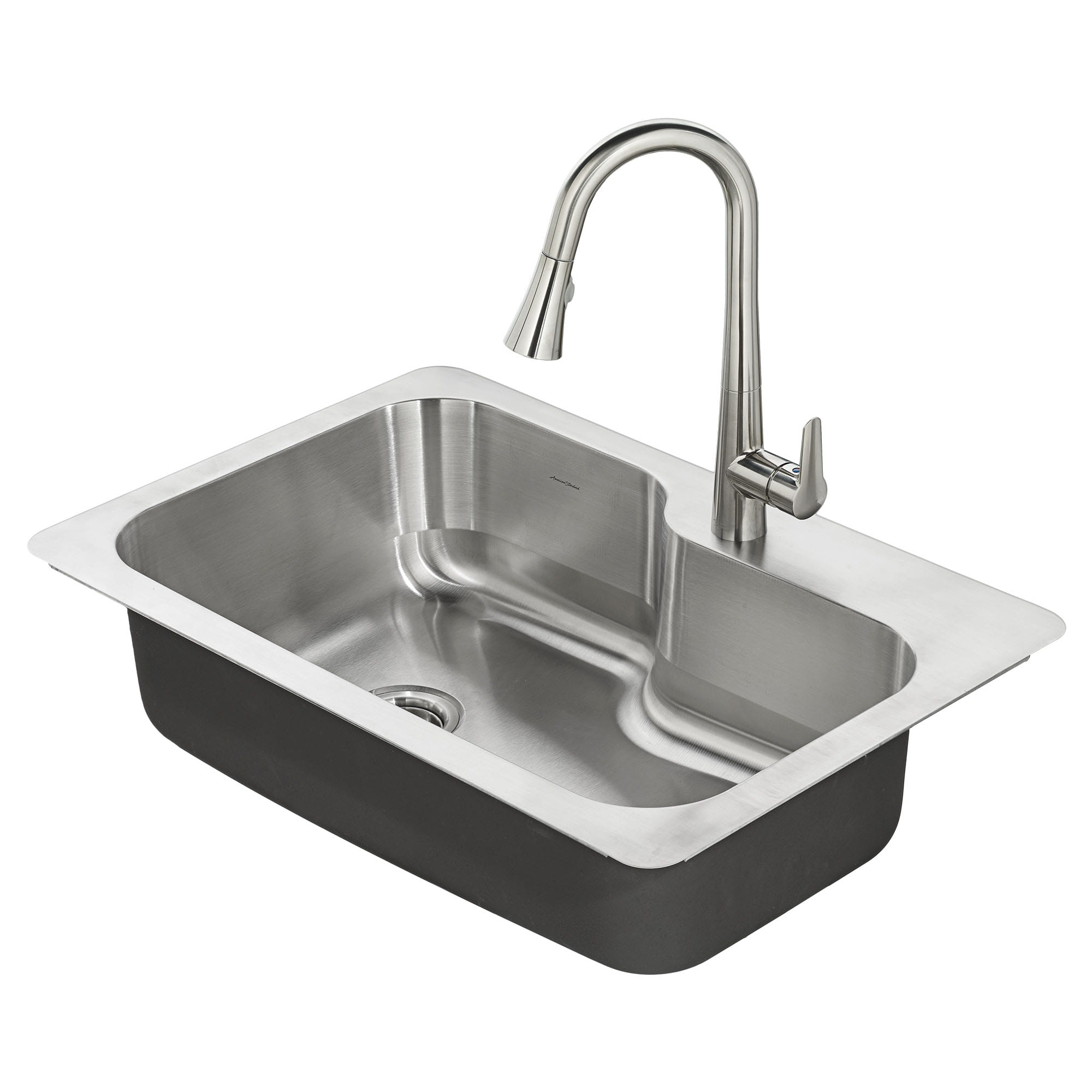 American Standard has created products with never-let-you-down performance and built-to-last quality for 150 years making everyday life better and more beautiful. The Raleigh Stainless Steel Single-Bowl Sink and Dual-Spray Faucet is the perfect example. Dual mount design allows for convenient, drop-in installation or mount under the counter for a custom look. Single-handle swivel faucet features pull-down spray head with toggle to switch from stream to spray. Includes sink strainers.