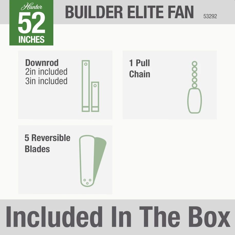 With a 52-inch blade span and multiple finishes to choose from, the casual, traditional style of the Builder Elite complements outdoor spaces without overpowering them. Perfect for any room or covered space exposed to moisture and humidity, this damp-rated fan is a great addition to a patio or sunroom oasis. A mainstay in the Hunter® product line, these outdoor ceiling fans without lights feature three-speed WhisperWind® motor technology to deliver quiet and ultra-powerful performance.