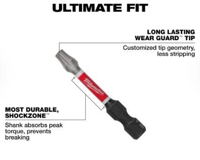 Our SHOCKWAVE™ Impact Duty Torx Bits provide the Ultimate Fit for a superior driving experience. The optimized SHOCKZONE™ shanks are customized per tip type to absorb peak torque and prevent breaking. The long lasting, Wear Guard™ Tip provides increased wear resistance, protecting the fit over the life of the bit. The customized tip geometry leads to less stripping of screws on the job site.