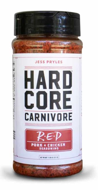 Hardcore Carnivore Red is our signature pork & chicken rub, with a blend of classic spices like garlic, black pepper, paprika and just a hint of heat. And that vivid color? Totally natural.