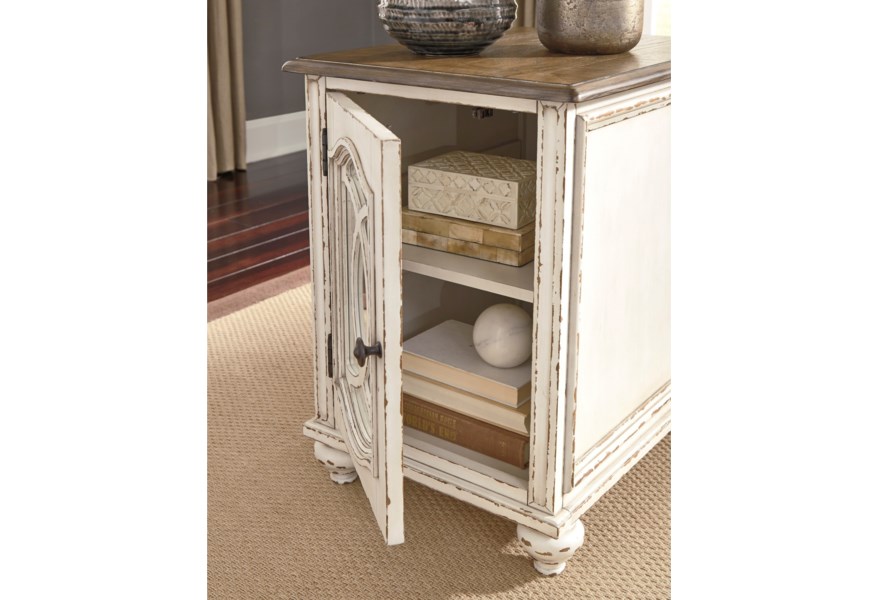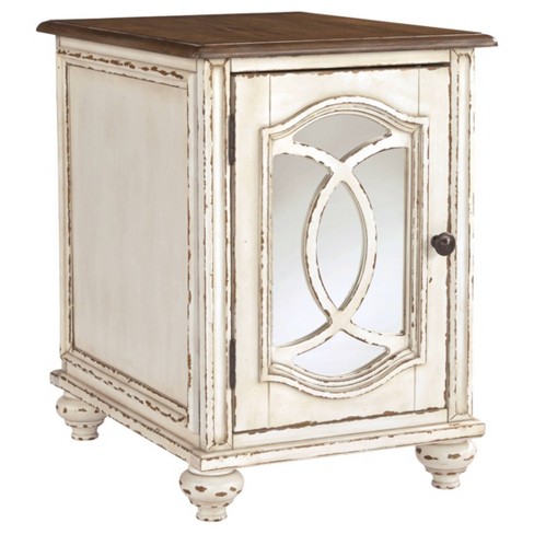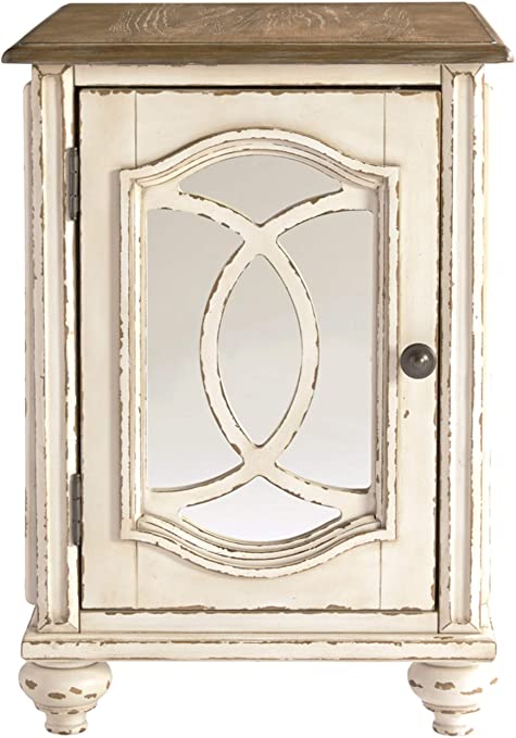 Elevating the art of traditional cottage styling, the Realyn chairside end table is sure to serve you beautifully for years to come. Antiqued two-tone aesthetic blends a chipped white with a distressed wood finished top for added charm. Cabinet door features inset mirror with filigree moulding for a fanciful twist.
