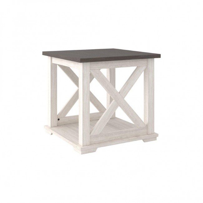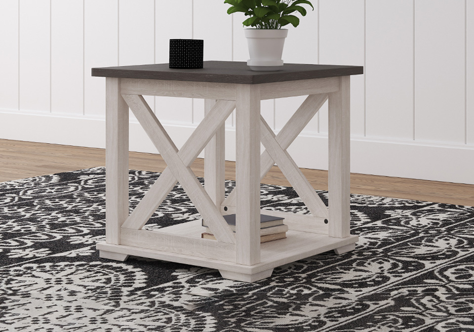 Raise the bar on modern farmhouse design with the Dorrinson end table. Sporting a two-tone, gray and antiqued white color scheme and cross buck design, this table makes a statement wherever it lands. With its generous shelved storage space, this home essential is packed with possibilities.