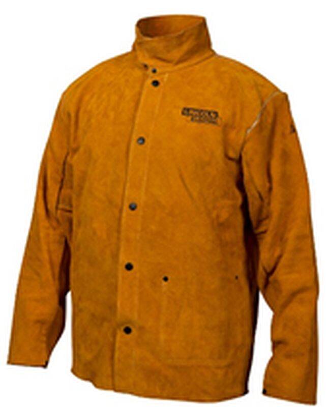 This Lincoln Electric heavy duty brown leather welding jacket protects the arms and torso from welding spatter and heat.