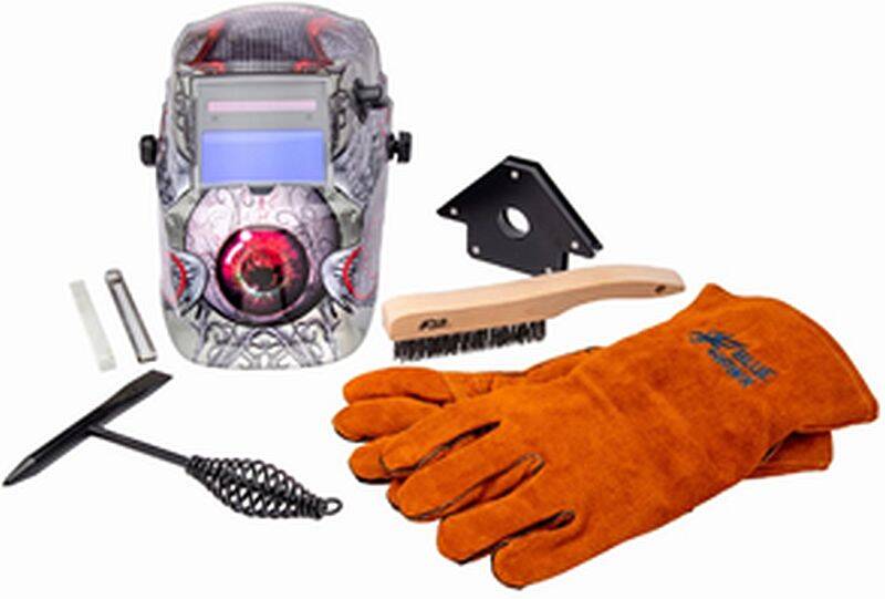 Lincoln Electric Auto-Darkening Welding Helmet has an auto-darkening lens that features 913 variable shade to match your welding needs. Ideal for a variety of welding and cutting processes including Stick, TIG, Pulsed TIG, MIG, Pulsed MIG, Flux-cored and gouging. ANSI approved and meets CSE/CE standard EN 379. The kit contains a helmet with bloodshot eyeball graphics, plus a pair of welding gloves, welding magnet, flat soapstone holder, 3 soapstones, wire welding brush and chipping hammer.