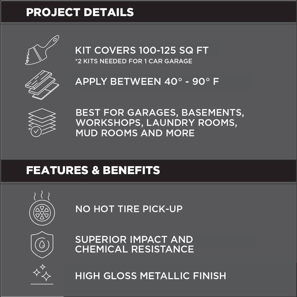 RockSolid Polycuramine Metallic Garage Floor Coating Kits come with the materials and tools needed to create a specialized floor with unparalleled durability and appearance. Low-odor formula is stronger than epoxy and resists chemical damage and hot tire pick up. Kit includes two-part easy-mix burst pouch, nap roller, metallic tint, concrete etch, stir stick and instructions. For best results, properly prepare surfaces per instructions before coating.
