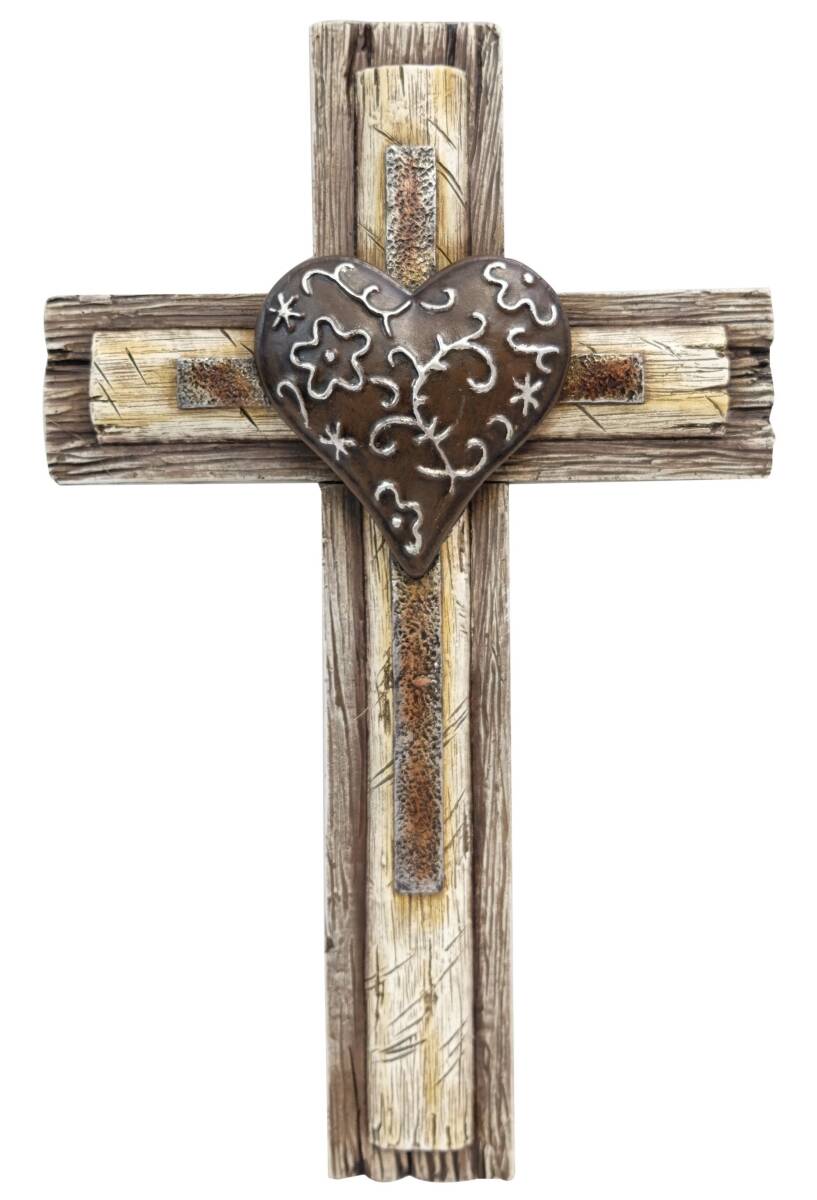 12-1/4-Inch Metal Heart On Wooden Wall Cross