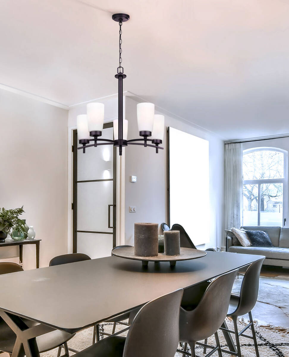 Enhance the beauty of your home with the ample light and transitional design of the PORTIA chandelier. PORTIA reminds us that while versatility is key it doesn't mean you have to lose your sense of style. By bringing a matte black finish and flat opal glass shades into your home with your lighting, you open the door to a variety of complementary decor options.