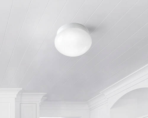 Flush mount light with white opal glass and white finish.