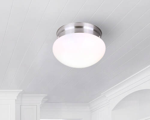 Flush mount light with white opal glass and brushed nickel finish.