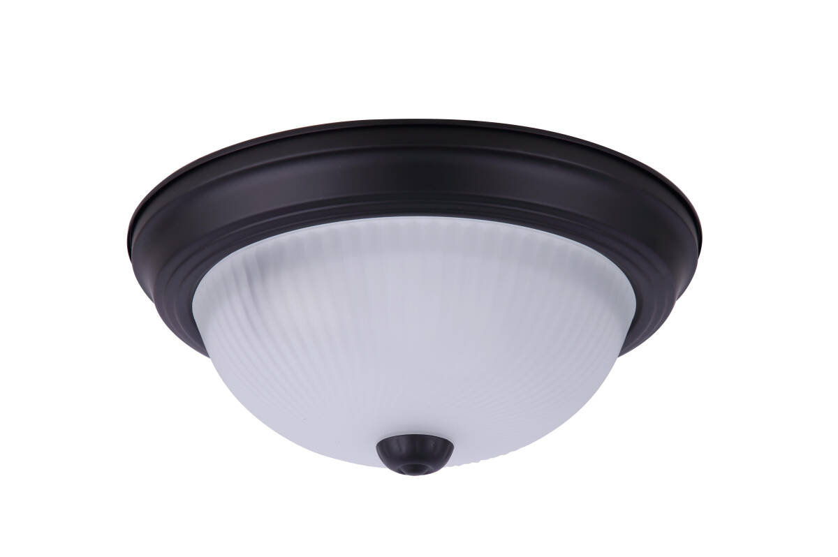 Flush mount light with frosted ribbed glass and a matte black finsh.