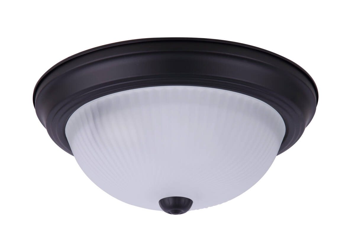 Flush mount light with frosted ribbed glass and a matte black finish.