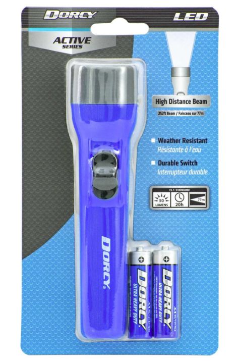The 50 Lumen 2 AA LED Deluxe Flashlight is a great value. A molded high resin form makes this light extremely durable. A super bright LED bulb provides 50 Lumens of clean, clear light with a beam distance of 50 m. With ten hours of continuous runtime, easy to use side barrel slide switch and convenient fold-away tail cap hang ring, this flashlight works well in any situation. The 50 Lumen 2 AA LED Deluxe Flashlight comes complete with 2 AA cell batteries.