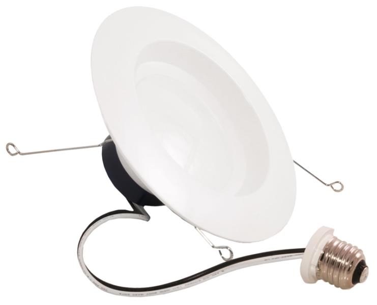625lm 3000K LED 2 pack recessed downlight kit replacing up to 60W incandescent suitable for 5 in " and 6 in " cans. Medium base socket adaptor included. Integrated white trim.