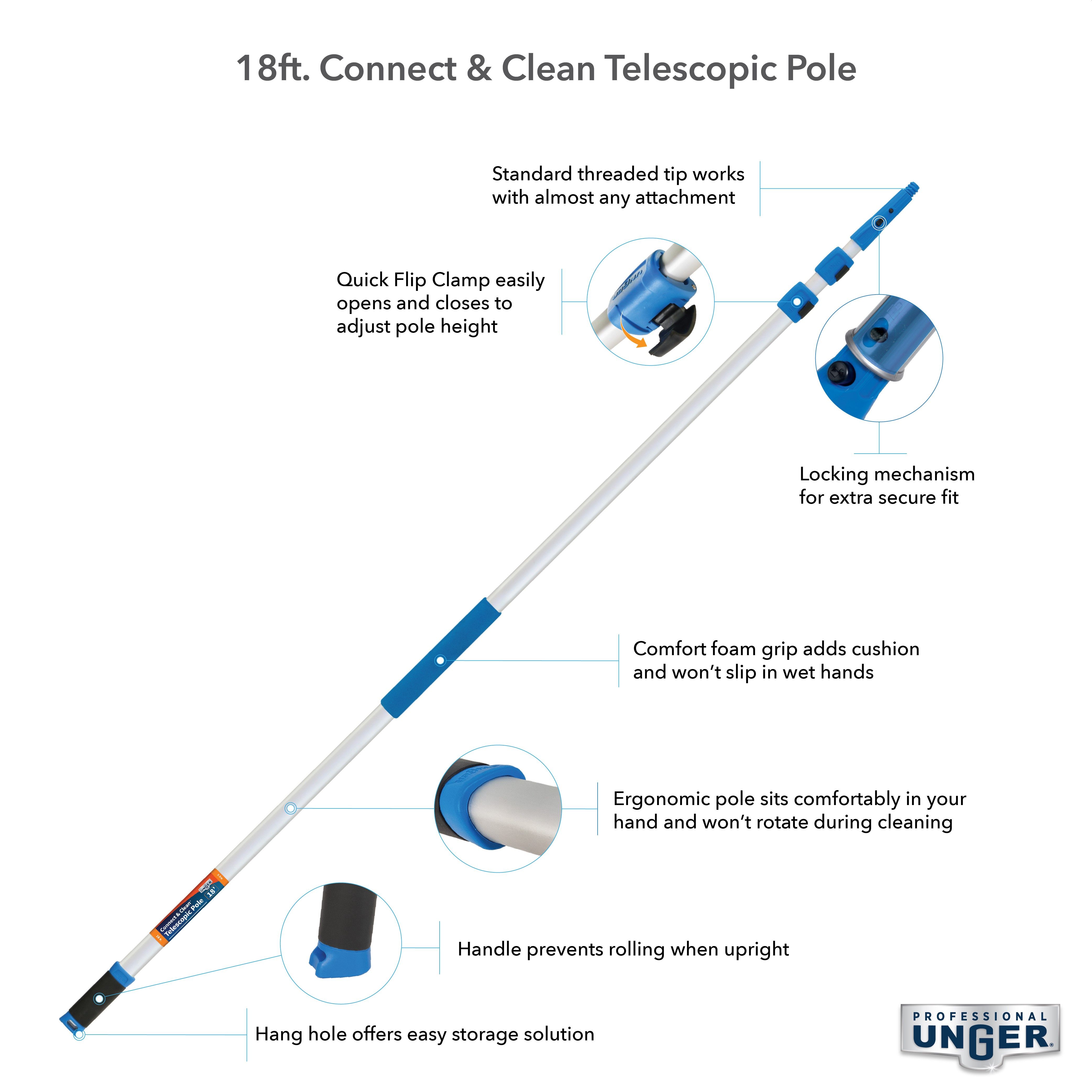 Extend your reach by 18 ft for high access cleaning with the Unger 18 ft Connect and Clean Pole. Tri-Shaped pole with comfort foam grips provide a more comfortable, ergonomic, grip. Quick-Flip clamps make extending the pole easy, and you can attach any standard threaded attachment to the reinforced Secure-Fit Locking cone.