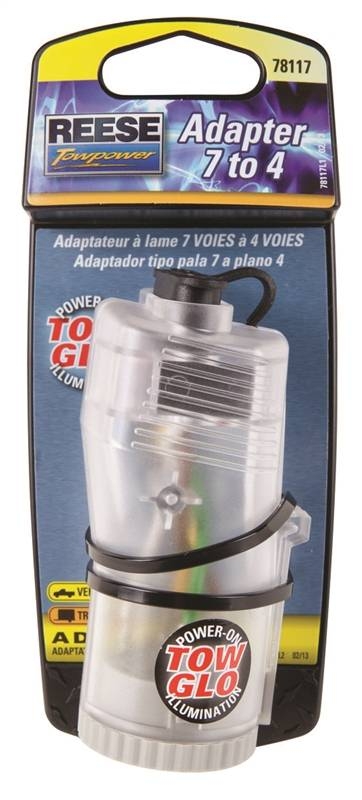 Adapt OEM 7-way blade connector to basic 4-flat connector. Glows when tail light circuit is activated, assists in seeing connection at night. Attached dust cover included to keep terminals clean when not in use.