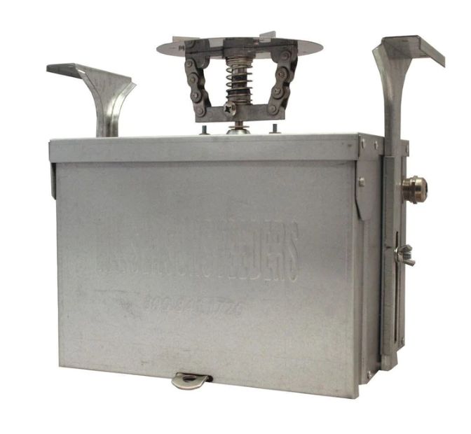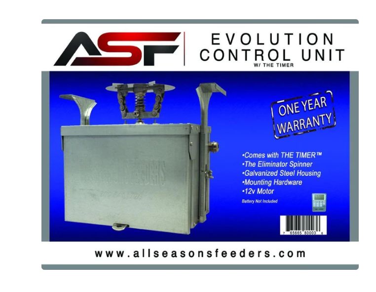 The Evolution Feeder control unit differs from the standard control unit because of its use of the eliminator scatter plate. The Eliminator scatter plate is varmint resistant in its construction, so no varmint basket is needed for any Evolution series control unit or feeder. We estimate the eliminator will spread 1.5 lbs of corn every 4 seconds.