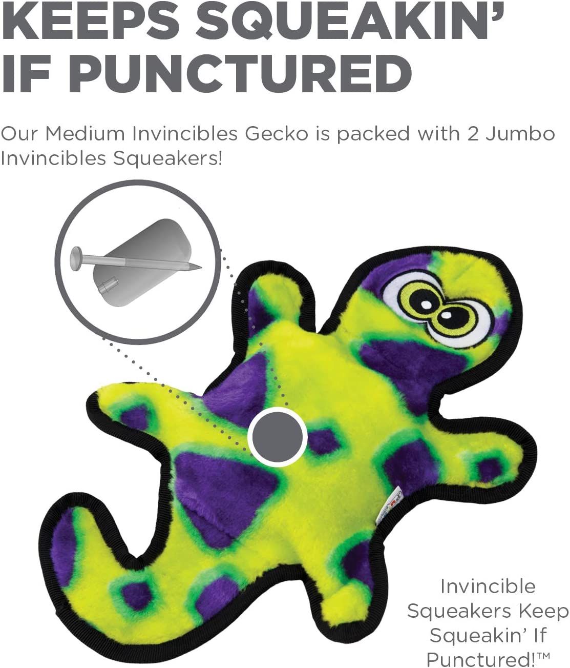 - The Invincibles Geckos are available in 2 different sizes so you can choose the right fit for your dog's size and activity level: Medium (2 squeakers) Large (4 squeakers)