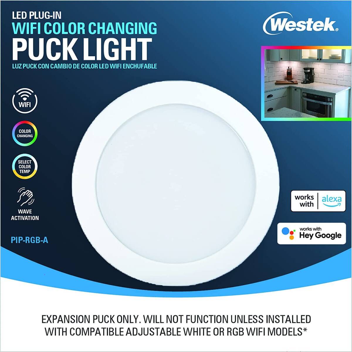 THIS IS THE ADD-ON PUCK FOR WIFI ENABLED MULTI COLOR PUCK LIGHTS: These WiFi enabled multi-color plug in puck lights feature both adjustable white control as well as multi-color control, all controllable with the Westek WiFiSmart app or integrated wave-sensor for touchless control. Or, pair these lights with Google Assistant or Alexa for voice control. Featuring up to 300 lumens of light output per light in an ultra-slim, mount-anywhere design, these lights are perfect for under cabinet task lighting or accent lighting in cabinets, closets, and more