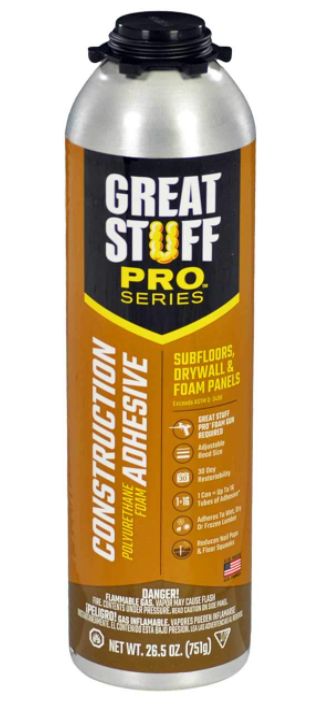 GREAT STUFF PRO Construction Adhesive is a premium grade, heavy-duty adhesive for interior and exterior use. Its all-weather formulation with freeze-thaw stability means it bonds lumber, plywood, particle board, masonry, drywall, concrete and foam panels in dry, damp and frozen conditions.