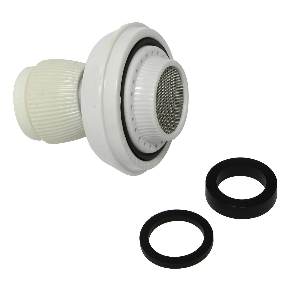 White plastic for use on standard kitchen faucets with inside or outside threads 55/64-27 female thread with 15/16-27 thread male adapter.