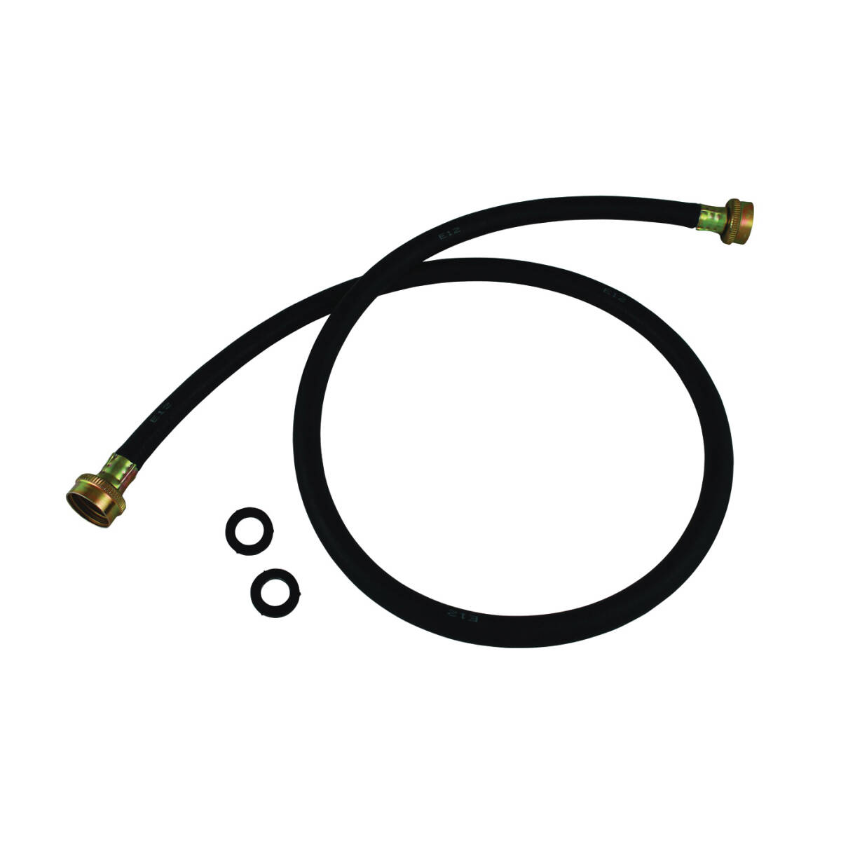 Rubber washing machine hose. For both hot or cold water. I.O. couplings on straight end for positive seal. Specially compounded to resist hot water softening action. Burst pressure, 800 lb. Highest quality. Identical to original equipment hose. Female and female coupling.